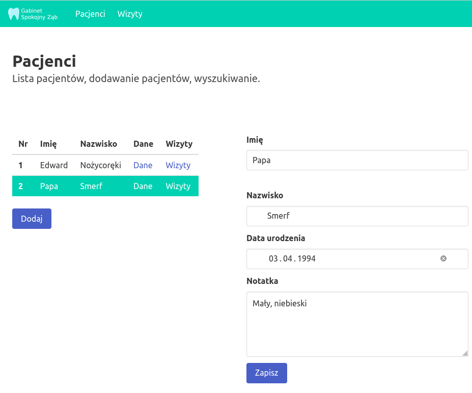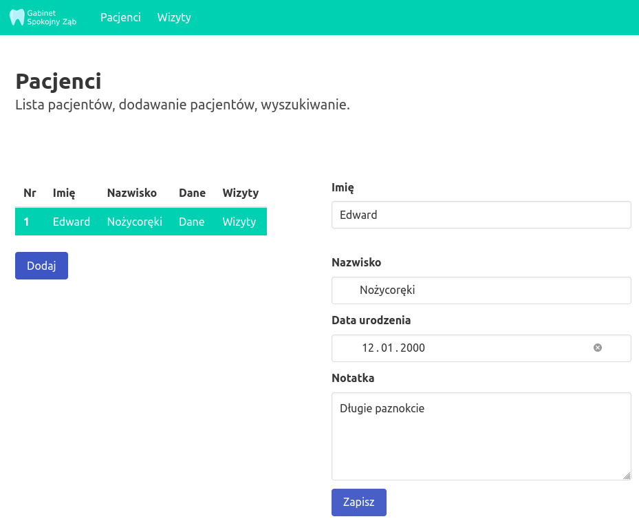 Zapisanie danych pacjenta powoduje dodanie go do tabelki pacjentów po lewej stronie.