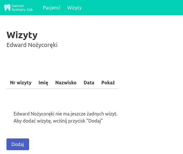 Jak widać, lista jest pusta, więc dodaję nową wizytę.