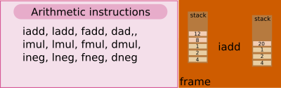 - each variant has an instrunction that takes argument (like: iload, lload etc) and has also a family of no-arg instrunctions, for which an operand is implicit and coded in the mnemonic (iload_0 loads 0-th local variable array element, iload_2 loads 2-nd local variable array element, iconst_m1 loads constant)