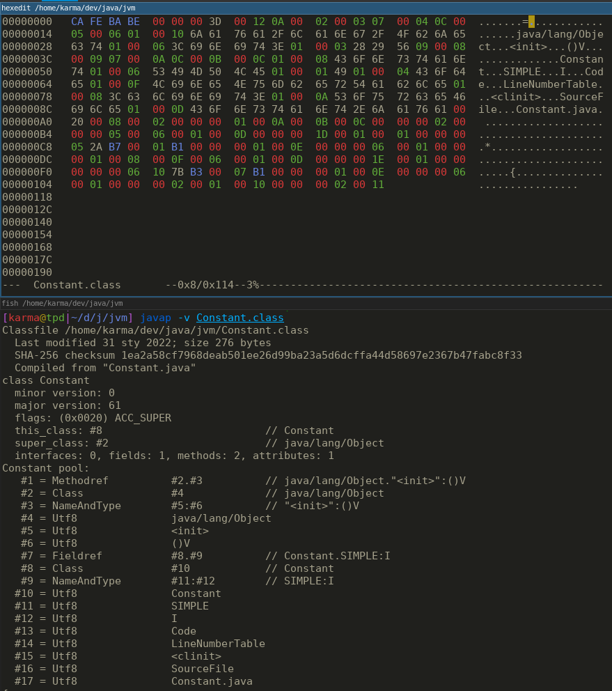 Here’s the .class contents in hexedit and constants reported by javap: /posts/jvm-spec/chapter_4_constant_pool/hexedit_and_constants.png