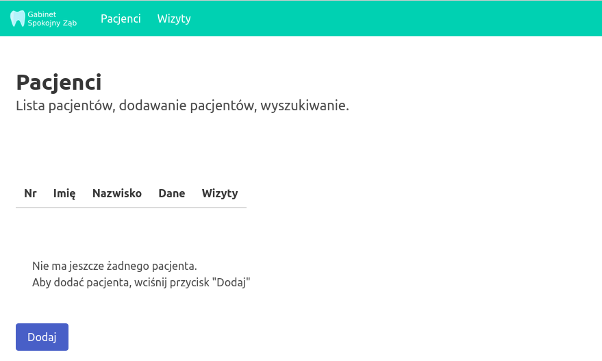 Jak widać, lista jest pusta, więc dodaję nową wizytę.